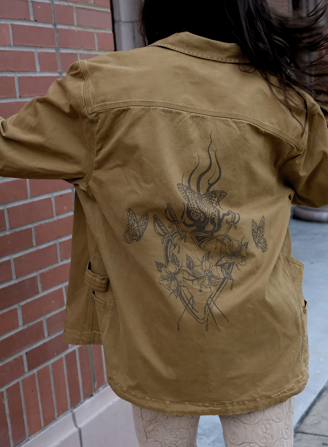 Lee overshirt in duck hunter brown with three of swords screen print size large