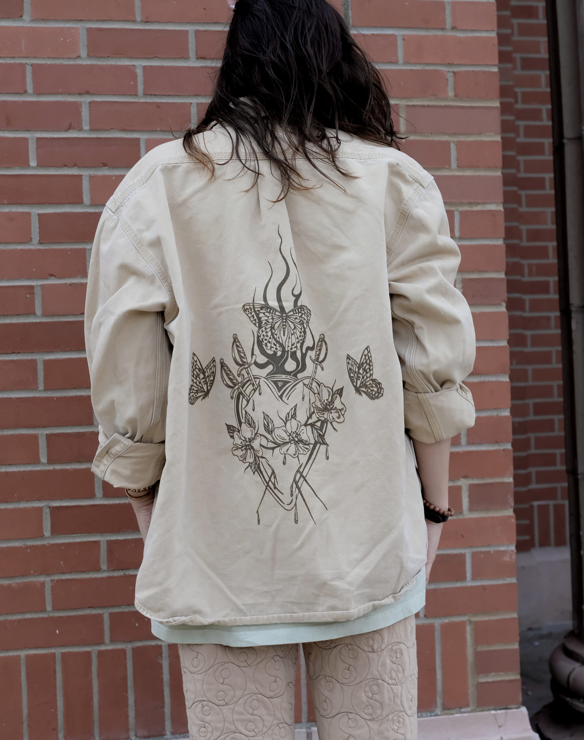vintage carhartt overshirt size large with three of swords print in taupe